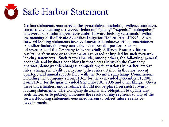 | Safe Harbor Statement Certain statements contained in this presentation, including, without limitation, statements containing the words "believes," "plans," "expects," "anticipates," and words of similar import, constitute "forward-looking statements" within the meaning of the Private Securities Litigation Reform Act of 1995. Such forward-looking statements involve known and unknown risks, uncertainties and other factors that may cause the actual results, performance or achievements of the Company to be materially different from any future results, performance or achievements expressed or implied by such forward- looking statements. Such factors include, among others, the following: general economic and business conditions in those areas in which the Company operates; demographic changes; competition; fluctuations in market interest rates; changes in credit quality; and other risks detailed in the most recent quarterly and annual reports filed with the Securities Exchange Commission, including the Company's Form 10-K for the year ended December 31, 2005, Form 10-Q for the quarter ended September 30, 2006 and other filings. Given these uncertainties, undue reliance should not be placed on such forward- looking statements. The Company disclaims any obligation to update any such factors or to publicly announce the results of any revisions to any of the forward-looking statements contained herein to reflect future events or developments. |