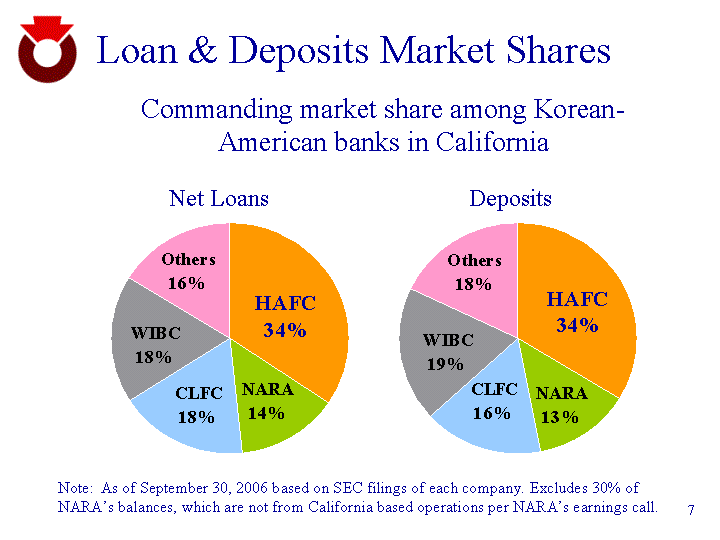 | Loan & Deposits Market Shares Commanding market share among Korean- American banks in California HAFC 2974 NARA 1154 CLFC 1415 WIBC 1661 Others 1574 Deposits Net Loans Note: As of September 30, 2006 based on SEC filings of each company. Excludes 30% of NARA's balances, which are not from California based operations per NARA's earnings call. HAFC 2822 NARA 1148 CLFC 1436 WIBC 1491 Others 1327 |