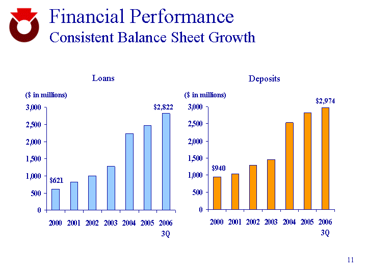 | Financial Performance Consistent Balance Sheet Growth 2000 2001 2002 2003 2004 2005 2006 3Q Loans 620 820 1000 1270 2235 2469 2822 2000 2001 2002 2003 2004 2005 2006 3Q Deposits 940 1040 1290 1450 2529 2826 2974 ($ in millions) ($ in millions) Loans Deposits $621 $2,822 $940 $2,974 |