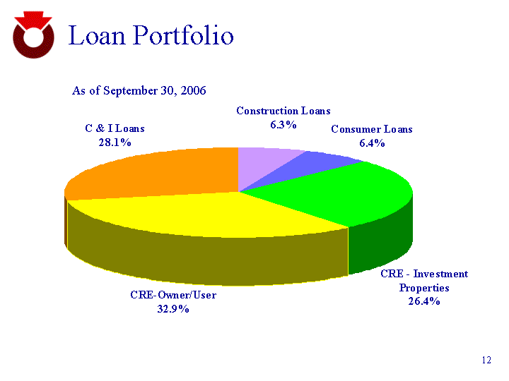 | Loan Portfolio As of September 30, 2006 Construction Loans 179 Consumer Loans 182 CRE-Investment Propertirs 753 CRE-Owner/User 938 C & I Loans 800 |