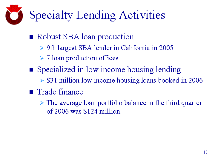 | Specialty Lending Activities Robust SBA loan production 9th largest SBA lender in California in 2005 7 loan production offices Specialized in low income housing lending $31 million low income housing loans booked in 2006 Trade finance The average loan portfolio balance in the third quarter of 2006 was $124 million. |