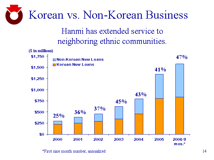 | Korean vs. Non-Korean Business 2000 2001 2002 2003 2004 2005 2006 9 mos.* Korean New Loans 221.1 245.7 287.4 344.5 452.4 800.8 832.4 Non-Korean New Loans 75.4 136.3 165.5 278.4 339.3 548.3 744 ($ in millions) Hanmi has extended service to neighboring ethnic communities. 45% 25% 43% 36% 37% 41% 47% *First nine month number, annualized |