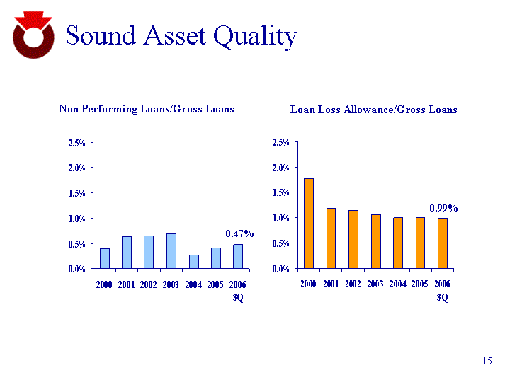 | Sound Asset Quality Non Performing Loans/Gross Loans 2000 2001 2002 2003 2004 2005 2006 3Q Hanmi 0.0178 0.0119 0.0114 0.0106 0.01 0.01 0.0099 Loan Loss Allowance/Gross Loans 2000 2001 2002 2003 2004 2005 2006 3Q Hanmi 0.004 0.0063 0.0065 0.0068 0.0027 0.0041 0.0047 0.99% 0.47% |