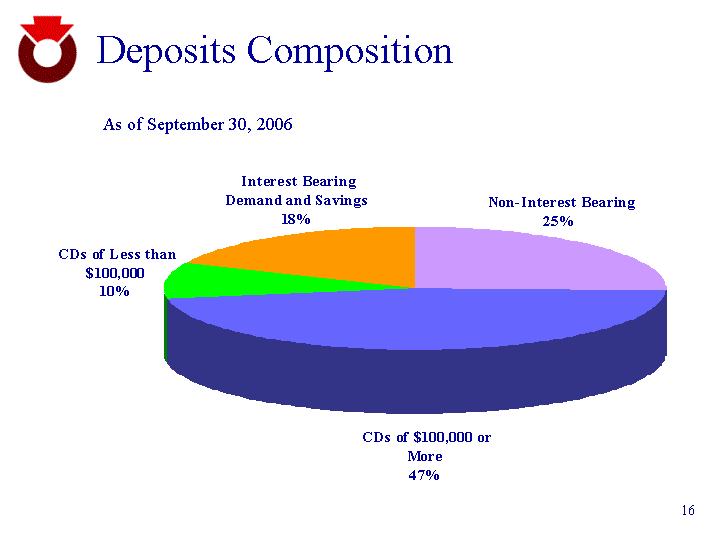 | Deposits Composition Non-Interest Bearing 757 TDs of $100,000 or More 1394 TDs of Less than $100,000 289 Interest Bearing Demand and Savings 534 As of September 30, 2006 |