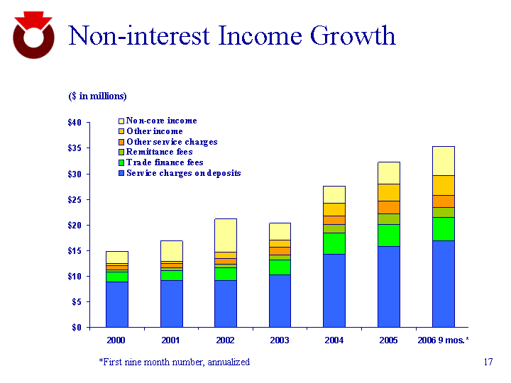 | Non-interest Income Growth 2000 2001 2002 2003 2004 2005 2006 9 mos.* Service charges on deposits 8.9 9.2 9.2 10.3 14.4 15.8 16.88 Trade finance fees 1.9 1.9 2.4 2.9 4 4.3 4.55 Remittance fees 0.5 0.6 0.8 1 1.7 2.1 2.05 Other service charges 0.8 0.8 1.1 1.5 1.7 2.5 2.32 Other income 0.4 0.4 1.2 1.3 2.4 3.3 3.8 Non-core income 2.3 4 6.5 3.3 3.4 4.2 5.76 ($ in millions) *First nine month number, annualized |