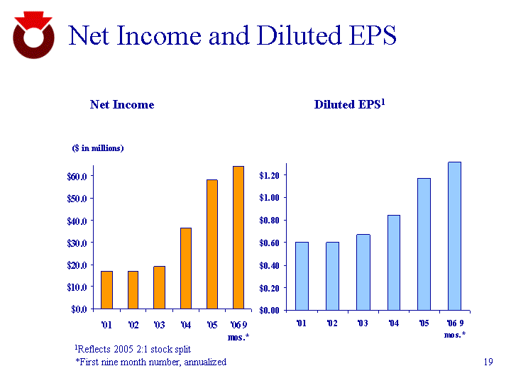 | Net Income and Diluted EPS Diluted EPS1 '01 '02 '03 '04 '05 '06 9 mos.* Net Income 16.8 17 19.2 36.7 58.2 64.5 Net Income ($ in millions) '01 '02 '03 '04 '05 '06 9 mos.* Diluted EPS 0.6 0.6 0.67 0.84 1.17 1.31 1Reflects 2005 2:1 stock split *First nine month number, annualized |