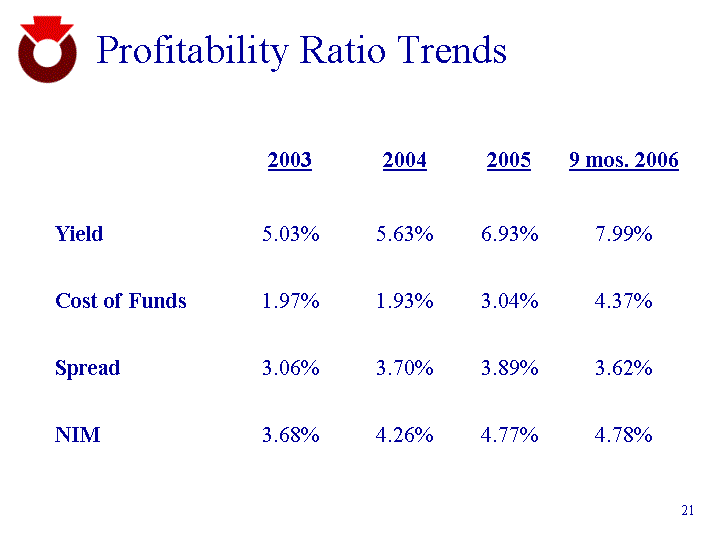 | Profitability Ratio Trends 2003 2004 2005 9 mos. 2006 Yield 5.03% 5.63% 6.93% 7.99% Cost of Funds 1.97% 1.93% 3.04% 4.37% Spread 3.06% 3.70% 3.89% 3.62% NIM 3.68% 4.26% 4.77% 4.78% |