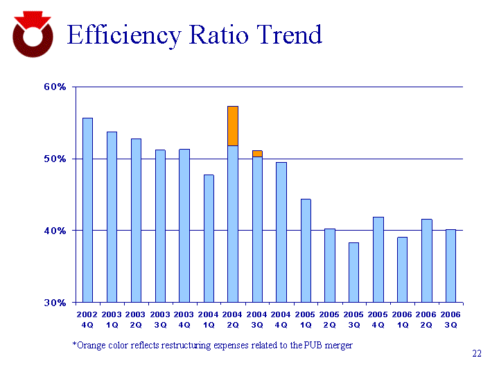 | Efficiency Ratio Trend *Orange color reflects restructuring expenses related to the PUB merger 2002 4Q 2003 1Q 2003 2Q 2003 3Q 2003 4Q 2004 1Q 2004 2Q 2004 3Q 2004 4Q 2005 1Q 2005 2Q 2005 3Q 2005 4Q 2006 1Q 2006 2Q 2006 3Q Efficiency Ratio 0.5565 0.5374 0.528 0.5123 0.5131 0.4777 0.5181 0.5029 0.4951 0.4438 0.403 0.3834 0.4193 0.391 0.4159 0.4014 Acquisition* 0 0 0 0 0 0 0.0557 0.0087 |