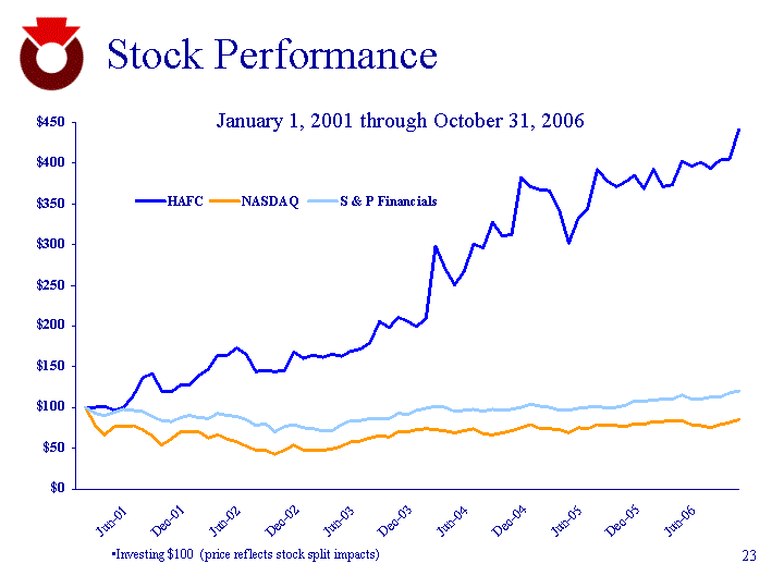 | Stock Performance Investing $100 (price reflects stock split impacts) HAFC NASDAQ S & P Financials 12/1/2000 100 100 100 20.4 1/1/2004 115.11 112.23 99.57 31.6 2/1/2004 115.11 87.1 92.89 43.9 3/1/2004 117.02 74.49 90 4/1/2004 111.95 85.66 93.22 5/1/2004 116.01 85.43 96.79 6/1/2004 131.91 87.45 96.67 7/1/2004 156.71 82.05 94.98 8/1/2004 162.46 73.08 89.05 9/1/2004 138.44 60.67 83.67 10/1/2004 137.43 68.41 81.98 11/1/2004 147.46 78.14 87.7 12/1/2004 147.58 78.95 89.47 1/2/2004 160.77 78.28 87.88 2/2/2004 168.43 70.09 86.47 3/2/2004 188.61 74.69 92.12 4/2/2004 189.18 68.34 89.53 5/2/2004 199.66 65.4 89.24 6/2/2004 190.08 59.23 84.85 7/2/2004 165.61 53.76 77.99 1/2/2001 2/1/2001 3/1/2001 4/2/2001 5/1/2001 6/1/2001 7/2/2001 8/1/2001 9/4/2001 10/1/2001 11/1/2001 12/3/2001 1/2/2002 2/4/2002 3/1/2002 4/1/2002 5/1/2002 6/3/2002 7/1/2002 8/1/2002 9/3/2002 10/1/2002 11/1/2002 12/2/2002 1/2/2003 2/3/2003 3/3/2003 4/1/2003 5/1/2003 6/2/2003 7/1/2003 8/1/2003 9/2/2003 10/1/2003 11/3/2003 12/1/2003 1/2/2004 2/2/2004 3/1/2004 4/1/2004 5/3/2004 6/1/2004 7/1/2004 8/2/2004 9/1/2004 10/1/2004 11/1/2004 12/1/2004 1/3/2005 2/1/2005 3/31/2005 4/5/2005 5/5/2005 6/5/2005 7/5/2005 8/5/2005 9/5/2005 10/5/2005 11/30/2005 12/30/2005 1/31/2006 2/3/2006 3/6/2006 4/6/2006 5/6/2006 6/6/2006 7/31/2006 8/31/2006 9/6/2006 10/6/2006 HAFC 100 100 101.65 97.11 100.83 114.67 136.16 141.12 120.25 119.21 128.1 128.1 139.67 146.28 163.84 164.26 173.35 165.08 143.8 145.04 144.42 145.66 167.36 160.54 164.46 161.16 165.7 162.81 169.63 171.9 179.75 205.79 197.73 210.95 205.58 198.76 209.09 297.73 270.25 251.03 266.94 301.03 295.87 327.48 310.33 312.19 382.02 371.28 366.94 365.5 341.94 302.69 332.02 345.04 392.56 379.13 370.87 377.69 384.92 369.01 392.36 370.87 373.14 402.48 396.07 401.65 393.39 403.31 404.96 441.53 NASDAQ 100 77.61 66.37 76.32 76.12 77.92 73.11 65.11 54.06 60.96 69.63 70.34 69.75 62.45 66.55 60.89 58.27 52.77 47.9 47.42 42.27 47.96 53.33 48.17 47.64 48.24 48.37 52.81 57.56 58.53 62.57 65.29 64.45 69.69 70.7 72.25 74.52 73.21 71.92 69.25 71.65 73.85 68.07 66.29 68.41 71.23 75.62 78.46 74.38 74 72.1 69.31 74.59 74.19 78.8 77.62 77.6 76.47 80.53 79.54 83.16 82.28 84.39 83.76 78.58 78.34 75.53 78.76 81.45 85.36 S & P Financials 100 93.29 90.39 93.62 97.21 97.09 95.39 89.43 84.03 82.34 88.07 89.85 88.26 86.85 92.52 89.92 89.62 85.22 78.32 79.78 70.31 76.5 79.51 75.09 73.68 71.26 70.84 79.37 83.4 83.46 87.06 86.04 86.45 92.17 91.76 96.06 98.9 101.38 100.18 95.31 96.93 97.22 94.97 98.02 96.99 97.21 99.91 103.97 101.56 100.79 96.73 96.57 99.06 10 0.26 101.57 99.53 100.33 103.32 107.73 107.85 108.63 110.56 110.64 115.13 109.94 109.8 112.33 113.22 117.82 120.49 January 1, 2001 through October 31, 2006 |