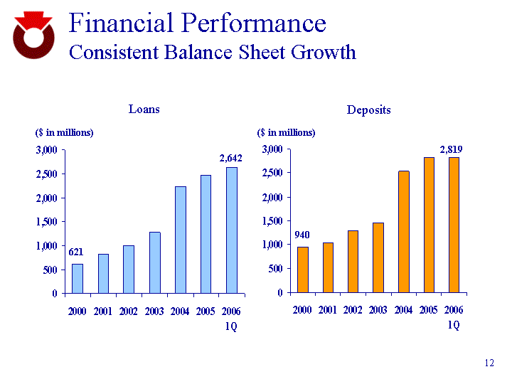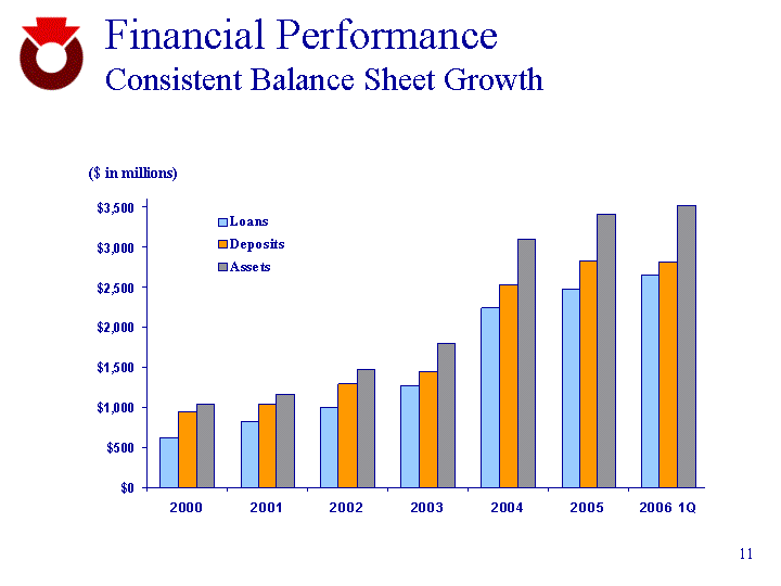 | Financial Performance Consistent Balance Sheet Growth 2000 2001 2002 2003 2004 2005 2006 1Q Loans 620 820 1000 1270 2235 2469 2642 2000 2001 2002 2003 2004 2005 2006 1Q Deposits 940 1040 1290 1450 2529 2826 2819 ($ in millions) ($ in millions) Loans Deposits 621 2,642 940 2,819 |