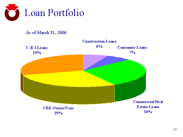 | Loan Portfolio As of March 31, 2006 Construction Loans 169.4 Consumer Loans 179.2 Commercial Real Estate Loans 766.2 CRE-Owner/User 763.8 C & I Loans 794.7 |