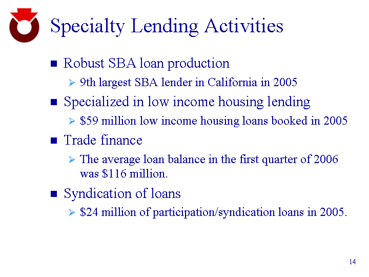 | Specialty Lending Activities Robust SBA loan production 9th largest SBA lender in California in 2005 Specialized in low income housing lending $59 million low income housing loans booked in 2005 Trade finance The average loan balance in the first quarter of 2006 was $116 million. Syndication of loans $24 million of participation/syndication loans in 2005. |