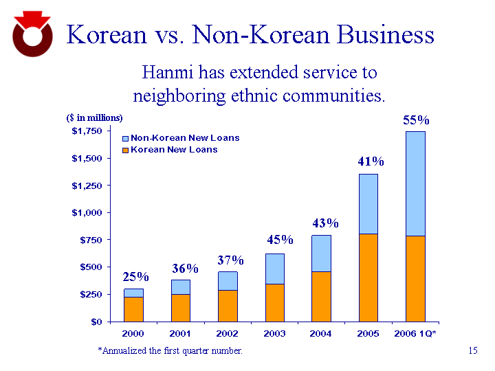 | Korean vs. Non-Korean Business 2000 2001 2002 2003 2004 2005 2006 1Q* Korean New Loans 221.1 245.7 287.4 344.5 452.4 800.8 782.9 Non-Korean New Loans 75.4 136.3 165.5 278.4 339.3 548.3 961.7 ($ in millions) Hanmi has extended service to neighboring ethnic communities. 45% 25% 43% 36% 37% 41% 55% *Annualized the first quarter number. |
