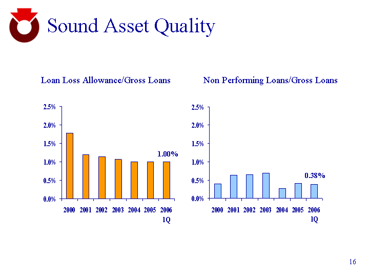 | Sound Asset Quality Loan Loss Allowance/Gross Loans 2000 2001 2002 2003 2004 2005 2006 1Q Hanmi 0.0178 0.0119 0.0114 0.0106 0.01 0.01 0.01 Non Performing Loans/Gross Loans 2000 2001 2002 2003 2004 2005 2006 1Q Hanmi 0.004 0.0063 0.0065 0.0068 0.0027 0.0041 0.0038 1.00% 0.38% |