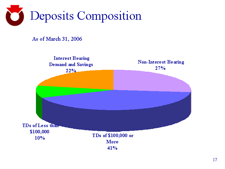 | Deposits Composition Non-Interest Bearing 748.5 TDs of $100,000 or More 1189 TDs of Less than $100,000 271.6 Interest Bearing Demand and Savings 609.6 As of March 31, 2006 |