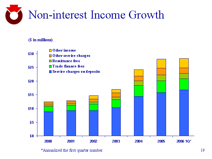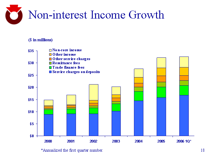 | Non-interest Income Growth 2000 2001 2002 2003 2004 2005 2006 1Q* Service charges on deposits 8.9 9.2 9.2 10.3 14.4 15.8 16.8 Trade finance fees 1.9 1.9 2.4 2.9 4 4.3 4 Remittance fees 0.5 0.6 0.8 1 1.7 2.1 1.96 Other service charges 0.8 0.8 1.1 1.5 1.7 2.5 2.12 Other income 0.4 0.4 1.2 1.3 2.4 3.3 3.4 Non-core income 2.3 4 6.5 3.3 3.4 4.2 4.28 ($ in millions) *Annualized the first quarter number. |
