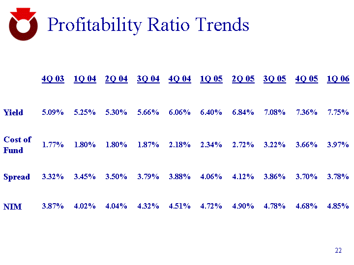 | Profitability Ratio Trends 4Q 03 1Q 04 2Q 04 3Q 04 4Q 04 1Q 05 2Q 05 3Q 05 4Q 05 1Q 06 Yield 5.09% 5.25% 5.30% 5.66% 6.06% 6.40% 6.84% 7.08% 7.36% 7.75% Cost of Fund 1.77% 1.80% 1.80% 1.87% 2.18% 2.34% 2.72% 3.22% 3.66% 3.97% Spread 3.32% 3.45% 3.50% 3.79% 3.88% 4.06% 4.12% 3.86% 3.70% 3.78% NIM 3.87% 4.02% 4.04% 4.32% 4.51% 4.72% 4.90% 4.78% 4.68% 4.85% |