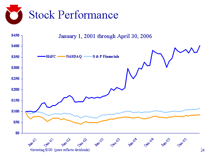 | Stock Performance Investing $100 (price reflects dividends) HAFC NASDAQ S & P Financials 12/1/2000 100 100 100 20.4 1/1/2004 115.11 112.23 99.57 31.6 2/1/2004 115.11 87.1 92.89 43.9 3/1/2004 117.02 74.49 90 4/1/2004 111.95 85.66 93.22 5/1/2004 116.01 85.43 96.79 6/1/2004 131.91 87.45 96.67 7/1/2004 156.71 82.05 94.98 8/1/2004 162.46 73.08 89.05 9/1/2004 138.44 60.67 83.67 10/1/2004 137.43 68.41 81.98 11/1/2004 147.46 78.14 87.7 12/1/2004 147.58 78.95 89.47 1/2/2004 160.77 78.28 87.88 2/2/2004 168.43 70.09 86.47 3/2/2004 188.61 74.69 92.12 4/2/2004 189.18 68.34 89.53 5/2/2004 199.66 65.4 89.24 6/2/2004 190.08 59.23 84.85 7/2/2004 165.61 53.76 77.99 1/2/2001 2/1/2001 3/1/2001 4/2/2001 5/1/2001 6/1/2001 7/2/2001 8/1/2001 9/4/2001 10/1/2001 11/1/2001 12/3/2001 1/2/2002 2/4/2002 3/1/2002 4/1/2002 5/1/2002 6/3/2002 7/1/2002 8/1/2002 9/3/2002 10/1/2002 11/1/2002 12/2/2002 1/2/2003 2/3/2003 3/3/2003 4/1/2003 5/1/2003 6/2/2003 7/1/2003 8/1/2003 9/2/2003 10/1/2003 11/3/2003 12/1/2003 1/2/2004 2/2/2004 3/1/2004 4/1/2004 5/3/2004 6/1/2004 7/1/2004 8/2/2004 9/1/2004 10/1/2004 11/1/2004 12/1/2004 1/3/2005 2/1/2005 3/31/2005 4/5/2005 5/5/2005 6/5/2005 7/5/2005 8/5/2005 9/5/2005 10/5/2005 11/30/2005 12/30/2005 1/31/2006 2/3/2006 3/6/2006 4/6/2006 HAFC 100 100 101.65 97.11 100.83 114.67 136.16 141.12 120.25 119.21 128.1 128.1 139.67 146.28 163.84 164.26 173.35 165.08 143.8 145.04 144.42 145.66 167.36 160.54 164.46 161.16 165.7 162.81 169.63 171.9 179.75 205.79 197.73 210.95 205.58 198.76 209.09 297.73 270.25 251.03 266.94 301.03 295.87 327.48 310.33 312.19 382.02 371.28 366.94 365.5 341.94 302.69 332.02 345.04 392.56 379.13 370.87 377.69 384.92 369.01 392.36 370.87 373.14 402.48 NASDAQ 100 77.61 66.37 76.32 76.12 77.92 73.11 65.11 54.06 60.96 69.63 70.34 69.75 62.45 66.55 60.89 58.27 52.77 47.9 47.42 42.27 47.96 53.33 48.17 47.64 48.24 48.37 52.81 57.56 58.53 62.57 65.29 64.45 69.69 70.7 72.25 74.52 73.21 71.92 69.25 71.65 73.85 68.07 66.29 68.41 71.23 75.62 78.46 74.38 74 72.1 69.31 74.59 74.19 78.8 77.62 77.6 76.47 80.53 79.54 83.16 82.28 84.39 83.76 S & P Financials 100 93.29 90.39 93.62 97.21 97.09 95.39 89.43 84.03 82.34 88.07 89.85 88.26 86.85 92.52 89.92 89.62 85.22 78.32 79.78 70.31 76.5 79.51 75.09 73.68 71.26 70.84 79.37 83.4 83.46 87.06 86.04 86.45 92.17 91.76 96.06 98.9 101.38 100.18 95.31 96.93 97.22 94.97 98.02 96.99 97.21 99.91 103.97 101.56 100.79 96.73 96.57 99.06 100.26 101.57 99.53 100.33 103.32 107.73 107.85 108.63 110.56 110.64 115.13 January 1, 2001 through April 30, 2006 |
