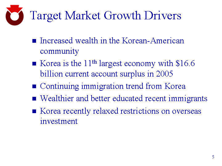 | Target Market Growth Drivers Increased wealth in the Korean-American community Korea is the 11th largest economy with $16.6 billion current account surplus in 2005 Continuing immigration trend from Korea Wealthier and better educated recent immigrants Korea recently relaxed restrictions on overseas investment |
