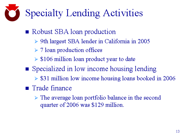 | Specialty Lending Activities Robust SBA loan production 9th largest SBA lender in California in 2005 7 loan production offices $106 million loan product year to date Specialized in low income housing lending $31 million low income housing loans booked in 2006 Trade finance The average loan portfolio balance in the second quarter of 2006 was $129 million. |