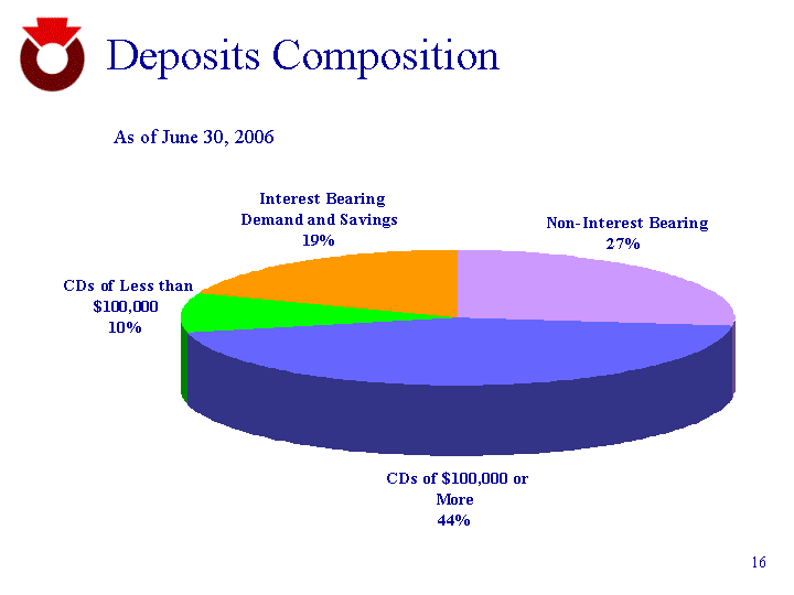 | Deposits Composition Non-Interest Bearing 778.5 TDs of $100,000 or More 1287 TDs of Less than $100,000 277.8 Interest Bearing Demand and Savings 551.4 As of June 30, 2006 |