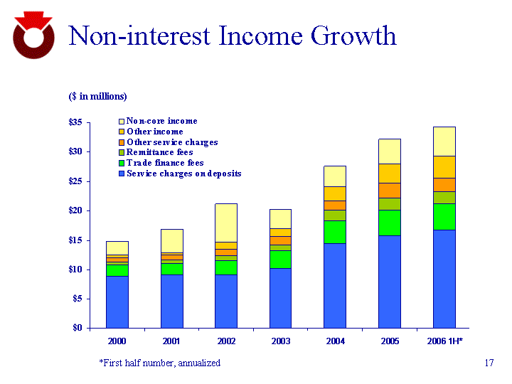 | Non-interest Income Growth 2000 2001 2002 2003 2004 2005 2006 1H* Service charges on deposits 8.9 9.2 9.2 10.3 14.4 15.8 16.83 Trade finance fees 1.9 1.9 2.4 2.9 4 4.3 4.4 Remittance fees 0.5 0.6 0.8 1 1.7 2.1 2 Other service charges 0.8 0.8 1.1 1.5 1.7 2.5 2.3 Other income 0.4 0.4 1.2 1.3 2.4 3.3 3.8 Non-core income 2.3 4 6.5 3.3 3.4 4.2 5 ($ in millions) *First half number, annualized |