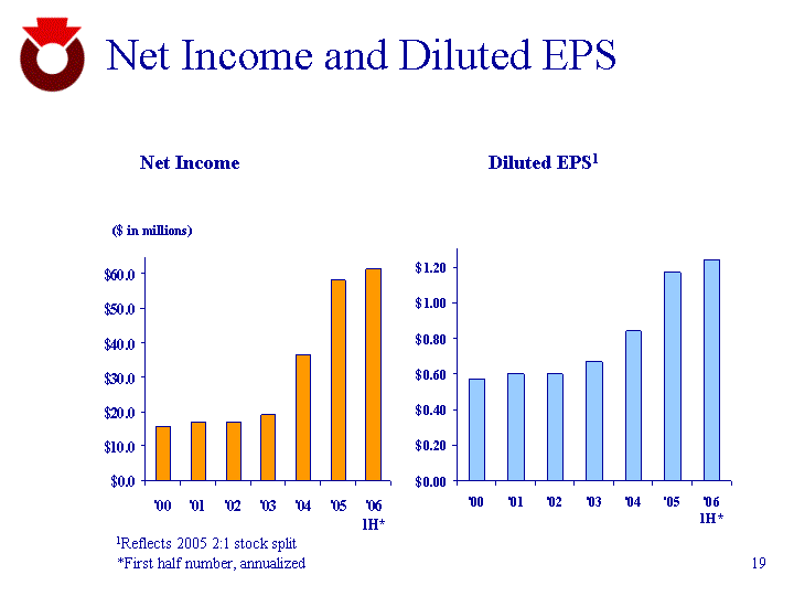 | Net Income and Diluted EPS Diluted EPS1 '00 '01 '02 '03 '04 '05 '06 1H* Net Income 15.5 16.8 17 19.2 36.7 58.2 61.48 Net Income ($ in millions) '00 '01 '02 '03 '04 '05 '06 1H* Diluted EPS 0.57 0.6 0.6 0.67 0.84 1.17 1.24 1Reflects 2005 2:1 stock split *First half number, annualized |