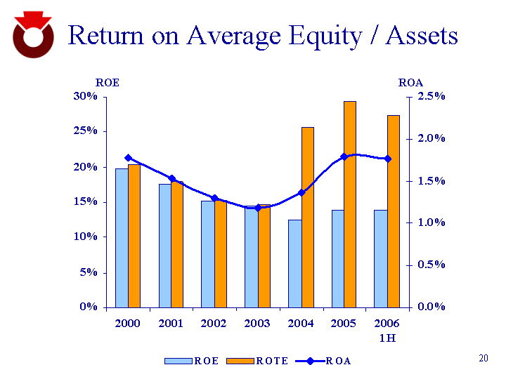 | Return on Average Equity / Assets ROA ROE 2000 2001 2002 2003 2004 2005 2006 1H ROE 0.1981 0.1756 0.1508 0.1451 0.1251 0.1394 0.1398 ROA 0.0178 0.0153 0.013 0.0118 0.0137 0.0179 0.0177 ROTE 0.2045 0.1798 0.1535 0.1475 0.2573 0.2933 0.2739 |