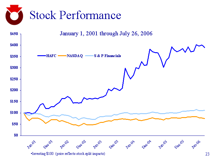 | Stock Performance Investing $100 (price reflects stock split impacts) HAFC NASDAQ S & P Financials 12/1/2000 100 100 100 20.4 1/1/2004 115.11 112.23 99.57 31.6 2/1/2004 115.11 87.1 92.89 43.9 3/1/2004 117.02 74.49 90 4/1/2004 111.95 85.66 93.22 5/1/2004 116.01 85.43 96.79 6/1/2004 131.91 87.45 96.67 7/1/2004 156.71 82.05 94.98 8/1/2004 162.46 73.08 89.05 9/1/2004 138.44 60.67 83.67 10/1/2004 137.43 68.41 81.98 11/1/2004 147.46 78.14 87.7 12/1/2004 147.58 78.95 89.47 1/2/2004 160.77 78.28 87.88 2/2/2004 168.43 70.09 86.47 3/2/2004 188.61 74.69 92.12 4/2/2004 189.18 68.34 89.53 5/2/2004 199.66 65.4 89.24 6/2/2004 190.08 59.23 84.85 7/2/2004 165.61 53.76 77.99 1/2/2001 2/1/2001 3/1/2001 4/2/2001 5/1/2001 6/1/2001 7/2/2001 8/1/2001 9/4/2001 10/1/2001 11/1/2001 12/3/2001 1/2/2002 2/4/2002 3/1/2002 4/1/2002 5/1/2002 6/3/2002 7/1/2002 8/1/2002 9/3/2002 10/1/2002 11/1/2002 12/2/2002 1/2/2003 2/3/2003 3/3/2003 4/1/2003 5/1/2003 6/2/2003 7/1/2003 8/1/2003 9/2/2003 10/1/2003 11/3/2003 12/1/2003 1/2/2004 2/2/2004 3/1/2004 4/1/2004 5/3/2004 6/1/2004 7/1/2004 8/2/2004 9/1/2004 10/1/2004 11/1/2004 12/1/2004 1/3/2005 2/1/2005 3/31/2005 4/5/2005 5/5/2005 6/5/2005 7/5/2005 8/5/2005 9/5/2005 10/5/2005 11/30/2005 12/30/2005 1/31/2006 2/3/2006 3/6/2006 4/6/2006 5/6/2006 6/6/2006 7/6/2006 HAFC 100 100 101.65 97.11 100.83 114.67 136.16 141.12 120.25 119.21 128.1 128.1 139.67 146.28 163.84 164.26 173.35 165.08 143.8 145.04 144.42 145.66 167.36 160.54 164.46 161.16 165.7 162.81 169.63 171.9 179.75 205.79 197.73 210.95 205.58 198.76 209.09 297.73 270.25 251.03 266.94 301.03 295.87 327.48 310.33 312.19 382.02 371.28 366.94 365.5 341.94 302.69 332.02 345.04 392.56 379.13 370.87 377.69 384.92 369.01 392.36 370.87 373.14 402.48 396.07 401.65 389.88 NASDAQ 100 77.61 66.37 76.32 76.12 77.92 73.11 65.11 54.06 60.96 69.63 70.34 69.75 62.45 66.55 60.89 58.27 52.77 47.9 47.42 42.27 47.96 53.33 48.17 47.64 48.24 48.37 52.81 57.56 58.53 62.57 65.29 64.45 69.69 70.7 72.25 74.52 73.21 71.92 69.25 71.65 73.85 68.07 66.29 68.41 71.23 75.62 78.46 74.38 74 72.1 69.31 74.59 74.19 78.8 77.62 77.6 76.47 80.53 79.54 83.16 82.28 84.39 83.76 78.58 78.34 74.67 S & P Financials 100 93.29 90.39 93.62 97.21 97.09 95.39 89.43 84.03 82.34 88.07 89.85 88.26 86.85 92.52 89.92 89.62 85.22 78.32 79.78 70.31 76.5 79.51 75.09 73.68 71.26 70.84 79.37 83.4 83.46 87.06 86.04 86.45 92.17 91.76 96.06 98.9 101.38 100.18 95.31 96.93 97.22 94.97 98.02 96.99 97.21 99.91 103.97 101.56 100.79 96.73 96.57 99.06 100.26 101.57 99.53 100.33 103.32 107.73 107.85 108.63 110.56 110.64 115.13 109.94 109.8 111.18 January 1, 2001 through July 26, 2006 |
