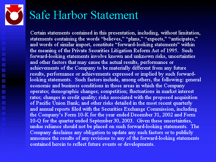 | Safe Harbor Statement Certain statements contained in this presentation, including, without limitation, statements containing the words "believes," "plans," "expects," "anticipates," and words of similar import, constitute "forward-looking statements" within the meaning of the Private Securities Litigation Reform Act of 1995. Such forward-looking statements involve known and unknown risks, uncertainties and other factors that may cause the actual results, performance or achievements of the Company to be materially different from any future results, performance or achievements expressed or implied by such forward- looking statements. Such factors include, among others, the following: general economic and business conditions in those areas in which the Company operates; demographic changes; competition; fluctuations in market interest rates; changes in credit quality; risks associated with the proposed acquisition of Pacific Union Bank; and other risks detailed in the most recent quarterly and annual reports filed with the Securities Exchange Commission, including the Company's Form 10-K for the year ended December 31, 2002 and Form 10-Q for the quarter ended September 30, 2003. Given these uncertainties, undue reliance should not be placed on such forward-looking statements. The Company disclaims any obligation to update any such factors or to publicly announce the results of any revisions to any of the forward-looking statements contained herein to reflect future events or developments. |