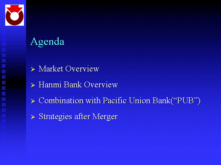 | Agenda Market Overview Hanmi Bank Overview Combination with Pacific Union Bank("PUB") Strategies after Merger |