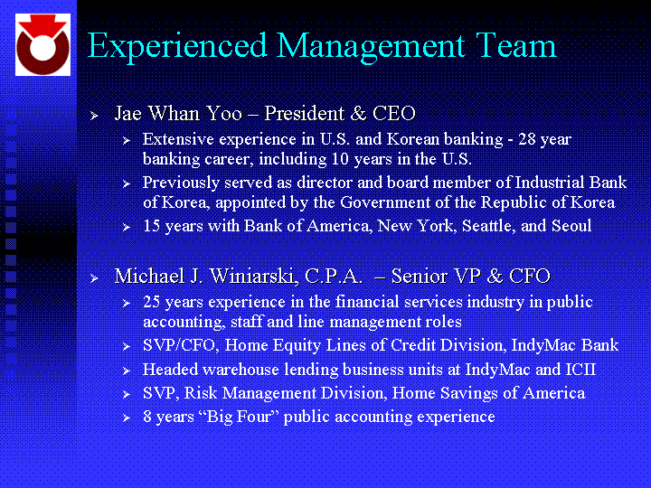 | Experienced Management Team Jae Whan Yoo - President & CEO Extensive experience in U.S. and Korean banking - 28 year banking career, including 10 years in the U.S. Previously served as director and board member of Industrial Bank of Korea, appointed by the Government of the Republic of Korea 15 years with Bank of America, New York, Seattle, and Seoul Michael J. Winiarski, C.P.A. - Senior VP & CFO 25 years experience in the financial services industry in public accounting, staff and line management roles SVP/CFO, Home Equity Lines of Credit Division, IndyMac Bank Headed warehouse lending business units at IndyMac and ICII SVP, Risk Management Division, Home Savings of America 8 years "Big Four" public accounting experience |