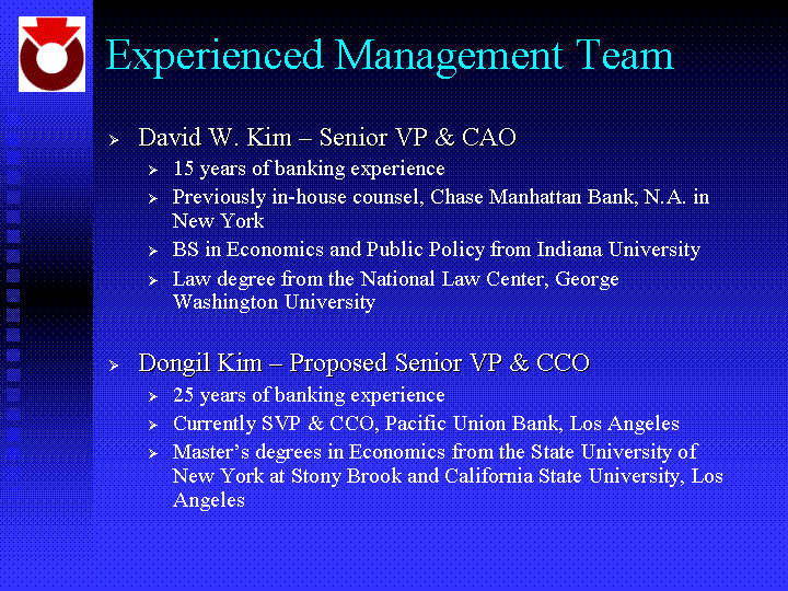 | Experienced Management Team David W. Kim - Senior VP & CAO 15 years of banking experience Previously in-house counsel, Chase Manhattan Bank, N.A. in New York BS in Economics and Public Policy from Indiana University Law degree from the National Law Center, George Washington University Dongil Kim - Proposed Senior VP & CCO 25 years of banking experience Currently SVP & CCO, Pacific Union Bank, Los Angeles Master's degrees in Economics from the State University of New York at Stony Brook and California State University, Los Angeles |