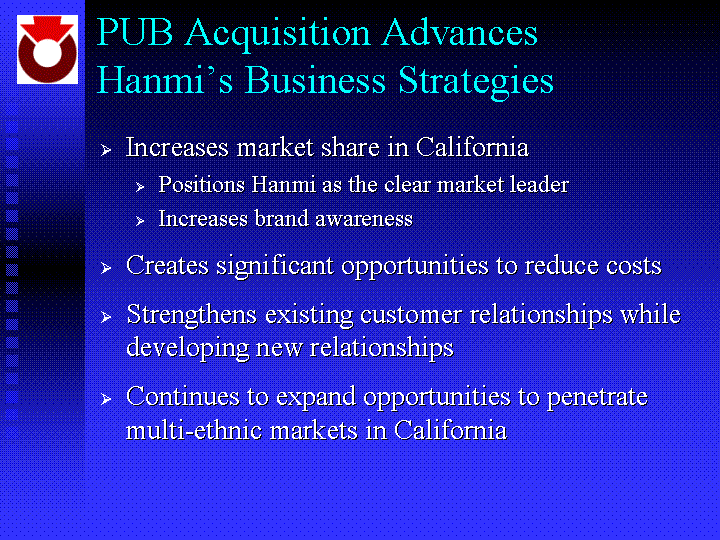 | PUB Acquisition Advances Hanmi's Business Strategies Increases market share in California Positions Hanmi as the clear market leader Increases brand awareness Creates significant opportunities to reduce costs Strengthens existing customer relationships while developing new relationships Continues to expand opportunities to penetrate multi-ethnic markets in California |