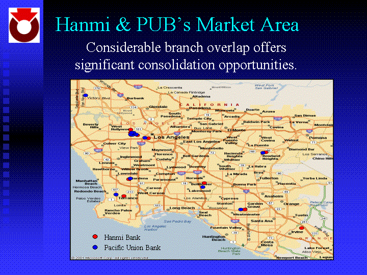 | Hanmi & PUB's Market Area Hanmi Bank Pacific Union Bank Considerable branch overlap offers significant consolidation opportunities. |