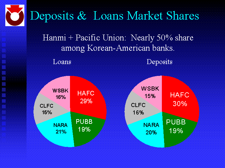| Deposits & Loans Market Shares Hanmi + Pacific Union: Nearly 50% share among Korean-American banks. HAFC 0.29 PUB 0.19 NARA 0.21 CLFC 0.15 WSBK 0.16 HAFC 0.3 PUB 0.19 NARA 0.2 CLFC 0.16 WSBK 0.15 Deposits Loans |