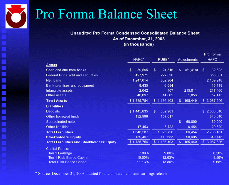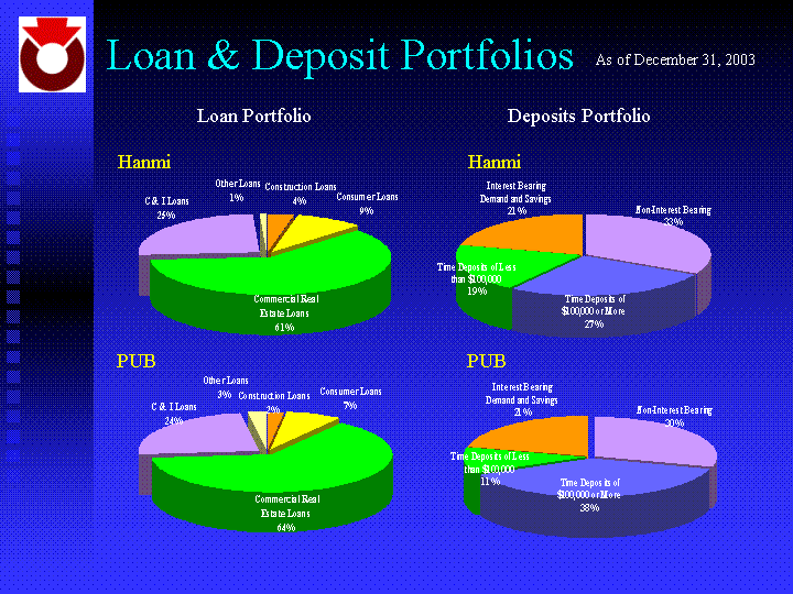 | Loan & Deposit Portfolios Construction Loans 45231 Consumer Loans 114691 Commercial Real Estate Loans 773223 C & I Loans 320762 Other Loans 10628 Loan Portfolio Deposits Portfolio Hanmi As of December 31, 2003 Construction Loans 19228 Consumer Loans 64745 Commercial Real Estate Loans 559593 C & I Loans 208126 Other Loans 22607 PUB Non-Interest Bearing 475100 Time Deposits of $100,000 or More 388944 Time Deposits of Less than $100,000 278836 Interest Bearing Demand and Savings 302955 Hanmi PUB Non-Interest Bearing 254623 Time Deposits of $100,000 or More 331805 Time Deposits of Less than $100,000 93687 Interest Bearing Demand and Savings 182866 |