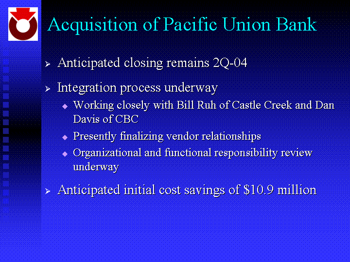 | Acquisition of Pacific Union Bank Anticipated closing remains 2Q-04 Integration process underway Working closely with Bill Ruh of Castle Creek and Dan Davis of CBC Presently finalizing vendor relationships Organizational and functional responsibility review underway Anticipated initial cost savings of $10.9 million |
