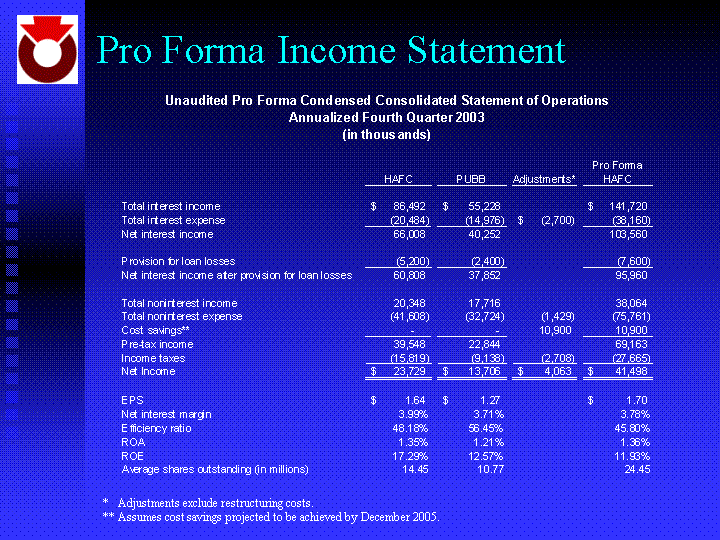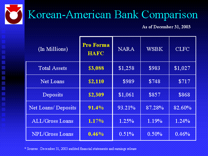 | Korean-American Bank Comparison (In Millions) Pro Forma HAFC NARA WSBK CLFC Total Assets $3,088 $1,258 $983 $1,027 Net Loans $2,110 $989 $748 $717 Deposits $2,309 $1,061 $857 $868 Net Loans/ Deposits 91.4% 93.21% 87.28% 82.60% ALL/Gross Loans 1.17% 1.25% 1.19% 1.24% NPL/Gross Loans 0.46% 0.51% 0.50% 0.46% As of December 31, 2003 * Sources : December 31, 2003 audited financial statements and earnings release |