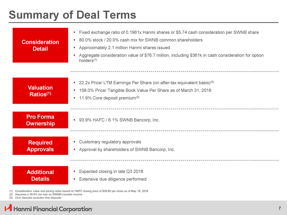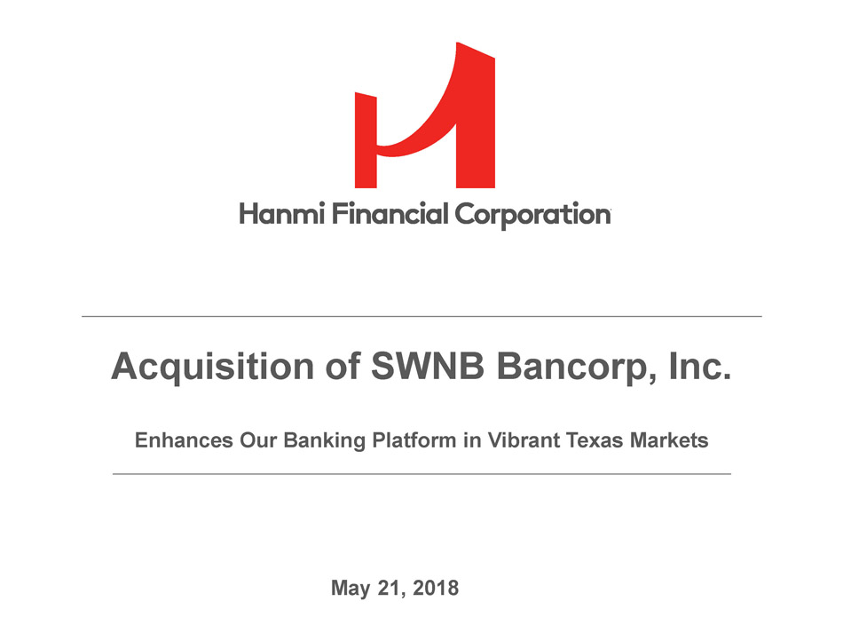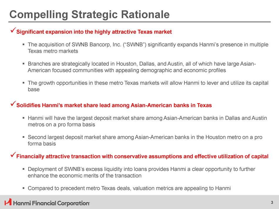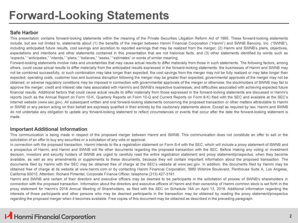 Safe Harbor This presentation contains forward - looking statements within the meaning of the Private Securities Litigation Reform Act of 1995 . These forward - looking statements include, but are not limited to, statements about ( 1 ) the benefits of the merger between Hanmi Financial Corporation (“Hanmi”) and SWNB Bancorp, Inc . (“SWNB”), including anticipated future results, cost savings and accretion to reported earnings that may be realized from the merger ; ( 2 ) Hanmi and SWNB’s plans, objectives, expectations and intentions and other statements contained in this presentation that are not historical facts ; and ( 3 ) other statements identified by words such as “expects,” “anticipates,” “intends,” “plans,” “believes,” “seeks,” “estimates” or words of similar meaning . Forward - looking statements involve risks and uncertainties that may cause actual results to differ materially from those in such statements . The following factors, among others, could cause actual results to differ materially from the anticipated results expressed in the forward - looking statements : the businesses of Hanmi and SWNB may not be combined successfully, or such combination may take longer than expected ; the cost savings from the merger may not be fully realized or may take longer than expected ; operating costs, customer loss and business disruption following the merger may be greater than expected ; governmental approvals of the merger may not be obtained, or adverse regulatory conditions may be imposed in connection with governmental approvals of the merger or otherwise ; the stockholders of SWNB may fail to approve the merger ; credit and interest rate risks associated with Hanmi’s and SWNB’s respective businesses ; and difficulties associated with achieving expected future financial results . Additional factors that could cause actual results to differ materially from those expressed in the forward - looking statements are discussed in Hanmi’s reports (such as the Annual Report on Form 10 - K, Quarterly Reports on Form 10 - Q and Current Reports on Form 8 - K) filed with the SEC and available at the SEC’s Internet website (www . sec . gov) . All subsequent written and oral forward - looking statements concerning the proposed transaction or other matters attributable to Hanmi or SWNB or any person acting on their behalf are expressly qualified in their entirety by the cautionary statements above . Except as required by law, Hanmi and SWNB do not undertake any obligation to update any forward - looking statement to reflect circumstances or events that occur after the date the forward - looking statement is made . Important Additional Information This communication is being made in respect of the proposed merger between Hanmi and SWNB . This communication does not constitute an offer to sell or the solicitation of an offer to buy any securities or a solicitation of any vote or approval . In connection with the proposed transaction, Hanmi intends to file a registration statement on Form S - 4 with the SEC, which will include a proxy statement of SWNB and a prospectus of Hanmi, and Hanmi and SWNB will file other documents regarding the proposed transaction with the SEC . Before making any voting or investment decision, investors and security holders of SWNB are urged to carefully read the entire registration statement and proxy statement/prospectus, when they become available, as well as any amendments or supplements to these documents, because they will contain important information about the proposed transaction . The documents filed by Hanmi with the SEC may be obtained free of charge at the SEC’s website at www . sec . gov . In addition, the documents filed by Hanmi may be obtained free of charge at its website at www . hanmi . com or by contacting Hanmi Financial Corporation, 3660 Wilshire Boulevard, Penthouse Suite A, Los Angeles, California 90010 , Attention : Richard Pimentel, Corporate Finance Officer, telephone ( 213 ) 427 - 3191 . Hanmi and SWNB and certain of their directors and executive officers may be deemed to be participants in the solicitation of proxies of SWNB’s shareholders in connection with the proposed transaction . Information about the directors and executive officers of Hanmi and their ownership of Hanmi common stock is set forth in the proxy statement for Hanmi’s 2018 Annual Meeting of Shareholders, as filed with the SEC on Schedule 14 A on April 13 , 2018 . Additional information regarding the interests of those participants and other persons who may be deemed participants in the transaction may be obtained by reading the proxy statement/prospectus regarding the proposed merger when it becomes available . Free copies of this document may be obtained as described in the preceding paragraph . 2 Forward - Looking Statements
