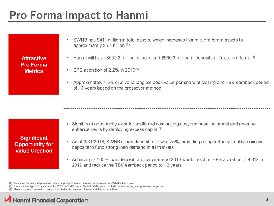 Compelling Strategic Rationale 3 x Significant expansion into the highly attractive Texas market ▪ The acquisition of SWNB Bancorp, Inc. (“SWNB”) significantly expands Hanmi’s presence in multiple Texas metro markets ▪ Branches are strategically located in Houston, Dallas, and Austin, all of which have large Asian - American focused communities with appealing demographic and economic profiles ▪ The growth opportunities in these metro Texas markets will allow Hanmi to lever and utilize its capital base x Solidifies Hanmi’s market share lead among Asian - American banks in Texas ▪ Hanmi will have the largest deposit market share among Asian - American banks in Dallas and Austin metros on a pro forma basis ▪ Second largest deposit market share among Asian - American banks in the Houston metro on a pro forma basis x Financially attractive transaction with conservative assumptions and effective utilization of capital ▪ Deployment of SWNB’s excess liquidity into loans provides Hanmi a clear opportunity to further enhance the economic merits of the transaction ▪ Compared to precedent metro Texas deals, valuation metrics are appealing to Hanmi
