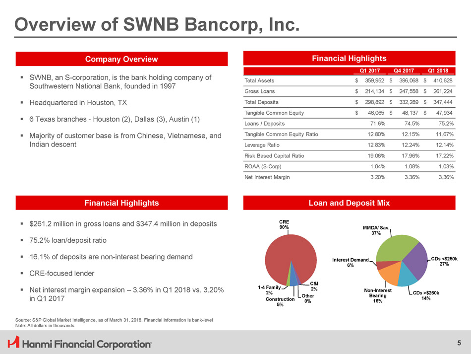 Pro Forma Impact to Hanmi ▪ SWNB has $411 million in total assets, which increases Hanmi’s pro forma assets to approximately $5.7 billion (1) ▪ Hanmi will have $552.3 million in loans and $660.3 million in deposits in Texas pro forma (1) ▪ EPS accretion of 2.2% in 2019 (2) ▪ Approximately 1.5% dilutive to tangible book value per share at closing and TBV earnback period of ~3 years based on the crossover method (1) Excludes merger and purchase accounting adjustments. Financial information for SWNB is bank - level (2) Hanmi’s average EPS estimates for 2019 per S&P Global Market Intelligence. Excludes non - recurring merger - related expenses (3) Revenue enhancements were not included in the base pro forma modeling assumptions Attractive Pro Forma Metrics ▪ Significant opportunity exist for additional cost savings beyond baseline model and revenue enhancements by deploying excess capital (3) ▪ As of 3/31/2018, SWNB’s loan/deposit ratio was 75%, providing an opportunity to utilize excess deposits to fund strong loan demand in all markets ▪ Achieving a 100% loan/deposit ratio by year - end 2018 would result in EPS accretion of 4.4% in 2019 and reduce the TBV earnback period to ~2 years Significant Opportunity for Value Creation 4