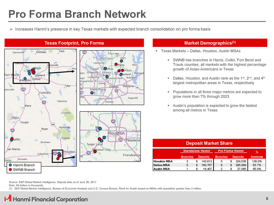Q1 2017 Q4 2017 Q1 2018 Total Assets $ 359 , 95 2 $ 396 , 06 8 $ 410 , 62 8 Gross Loans $ 214 , 13 4 $ 247 , 55 8 $ 261 , 22 4 Total Deposits $ 298 , 89 2 $ 332 , 28 9 $ 347 , 44 4 Tangible Common Equity $ 46 , 06 5 $ 48 , 13 7 $ 47 , 93 4 Loans / Deposits 71 . 6 % 74 . 5 % 75 . 2 % Tangible Common Equity Ratio 12 . 80 % 12 . 15 % 11 . 67 % Leverage Ratio 12 . 83 % 12 . 24 % 12 . 14 % Risk Based Capital Ratio 19 . 06 % 17 . 96 % 17 . 22 % ROAA (S - Corp) 1 . 04 % 1 . 08 % 1 . 03 % Net Interest Margin 3 . 20 % 3 . 36 % 3 . 36 % N on - I n t erest Bearing 16% Interest Demand 6% MMDA/ Sav. 37% CDs <$250k 27% CDs >$250k 14% 1 - 4 Family 2% C ons t ru cti on 5% CRE 90% C&I 2% O t her 0% Overview of SWNB Bancorp, Inc. Note: All dollars in thousands 5 Source: S&P Global Market Intelligence, as of March 31, 2018. Financial information is bank - level ▪ SWNB, an S - corporation, is the bank holding company of Southwestern National Bank, founded in 1997 ▪ Headquartered in Houston, TX ▪ 6 Texas branches - Houston (2), Dallas (3), Austin (1) ▪ Majority of customer base is from Chinese, Vietnamese, and Indian descent Financial Highlights Company Overview Financial Highlights Loan and Deposit Mix ▪ $261.2 million in gross loans and $347.4 million in deposits ▪ 75.2% loan/deposit ratio ▪ 16.1% of deposits are non - interest bearing demand ▪ CRE - focused lender ▪ Net interest margin expansion – 3.36% in Q1 2018 vs. 3.20% in Q1 2017