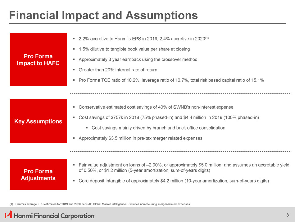Summary of Deal Terms Con si d erati o n Detail Pro Forma O w n e r s hi p Required A pp r o v als V al u ati o n Ratios (1) A dd iti on al Details ▪ Fixed exchange ratio of 0.1961x Hanmi shares or $5.74 cash consideration per SWNB share ▪ 80.0% stock / 20.0% cash mix for SWNB common shareholders ▪ Approximately 2.1 million Hanmi shares issued ▪ Aggregate consideration value of $76.7 million, including $361k in cash consideration for option holders (1) ▪ 22.2x Price/ LTM Earnings Per Share (on after - tax equivalent basis) (2) ▪ 158.0% Price/ Tangible Book Value Per Share as of March 31, 2018 ▪ 11.9% Core deposit premium (3) ▪ Customary regulatory approvals ▪ Approval by shareholders of SWNB Bancorp, Inc. ▪ 93.9% HAFC / 6.1% SWNB Bancorp, Inc. ▪ Expected closing in late Q3 2018 ▪ Extensive due diligence performed (1) Consideration value and pricing ratios based on HAFC closing price of $28.65 per share as of May 18, 2018 (2) Assumes a 30.0% tax rate on SWNB’s taxable income (3) Core deposits excludes time deposits 7