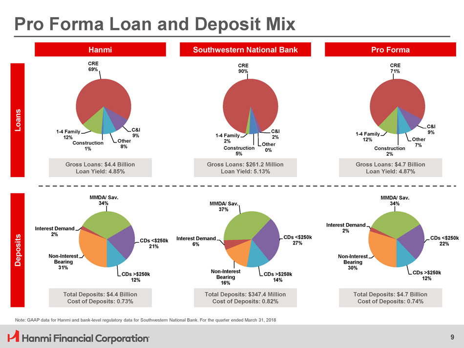 Financial Impact and Assumptions ▪ 2.2% accretive to Hanmi’s EPS in 2019; 2.4% accretive in 2020 (1) ▪ 1.5% dilutive to tangible book value per share at closing ▪ Approximately 3 year earnback using the crossover method ▪ Greater than 20% internal rate of return ▪ Pro Forma TCE ratio of 10.2%, leverage ratio of 10.7%, total risk based capital ratio of 15.1% Pro Forma Impact to HAFC Key Assumptions Pro Forma A d j u stme n ts ▪ Conservative estimated cost savings of 40% of SWNB’s non - interest expense ▪ Cost savings of $757k in 2018 (75% phased - in) and $4.4 million in 2019 (100% phased - in) ▪ Cost savings mainly driven by branch and back office consolidation ▪ Approximately $3.5 million in pre - tax merger related expenses ▪ Fair value adjustment on loans of – 2.00%, or approximately $5.0 million, and assumes an accretable yield of 0.50%, or $1.2 million (5 - year amortization, sum - of - years digits) ▪ Core deposit intangible of approximately $4.2 million (10 - year amortization, sum - of - years digits) (1) Hanmi’s average EPS estimates for 2019 and 2020 per S&P Global Market Intelligence. Excludes non - recurring merger - related expenses 8