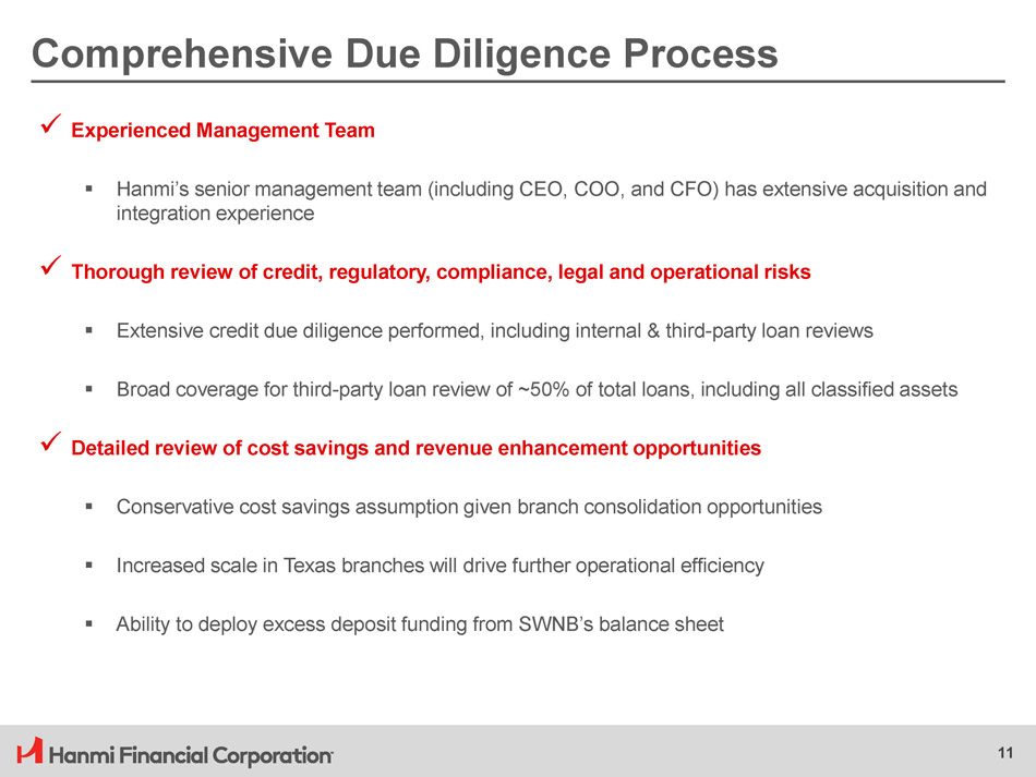 Complementary Combination Note: GAAP data for Hanmi and bank - level regulatory data for Southwestern National Bank. For the quarter ended March 31, 2018 10 Hanmi SWNB Pro Forma Asian - American Focus x x x Commercial Banking Platform x x x CRE Expertise x x x Strong Credit Quality x x x Loan / Deposit Ratio 100.8% 75.2% 99.1% Net Interest Margin 3.70% 3.36% 3.63% Total Deposits $4.4 billion $347.4 million $4.7 billion Loans in Texas $303.0 million $249.3 million $552.3 million Deposits in Texas $313.2 million $347.1 million $660.3 million Branches in Texas 9 6 12