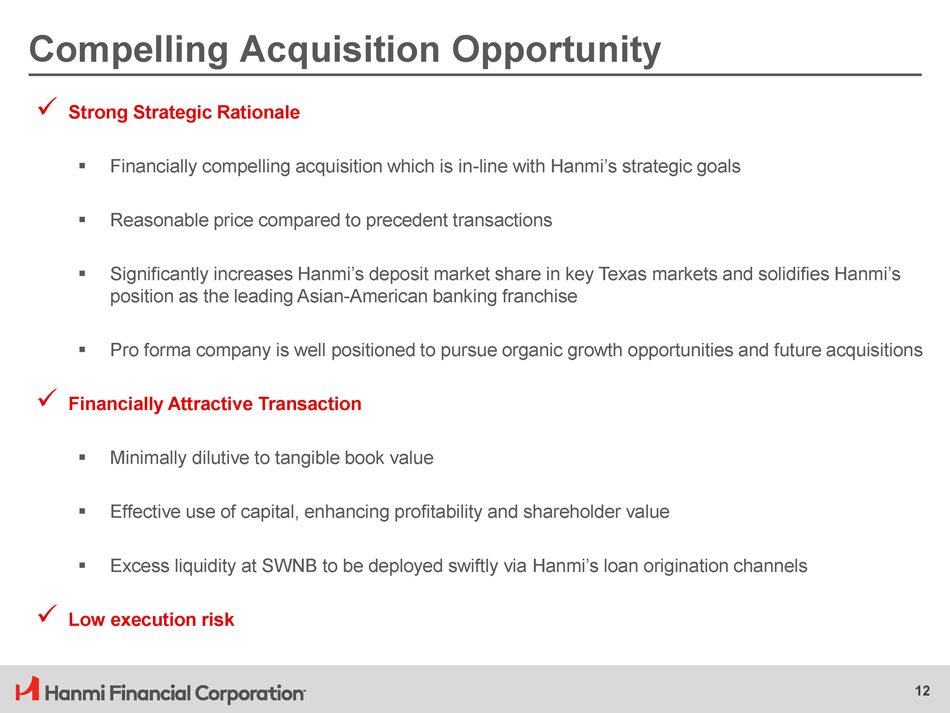 Comprehensive Due Diligence Process 11 x Experienced Management Team ▪ Hanmi’s senior management team (including CEO, COO, and CFO) has extensive acquisition and integration experience x Thorough review of credit, regulatory, compliance, legal and operational risks ▪ Extensive credit due diligence performed, including internal & third - party loan reviews ▪ Broad coverage for third - party loan review of ~50% of total loans, including all classified assets x Detailed review of cost savings and revenue enhancement opportunities ▪ Conservative cost savings assumption given branch consolidation opportunities ▪ Increased scale in Texas branches will drive further operational efficiency ▪ Ability to deploy excess deposit funding from SWNB’s balance sheet