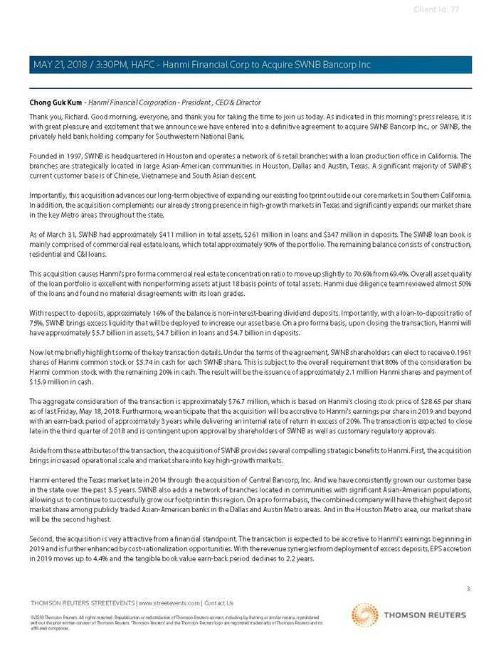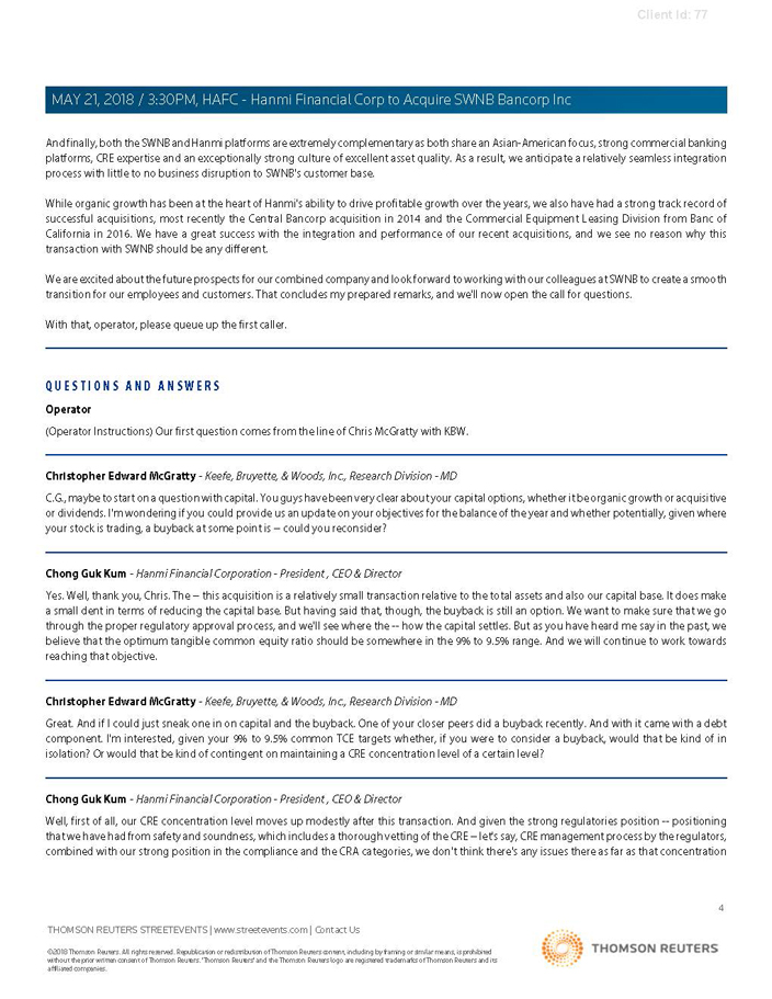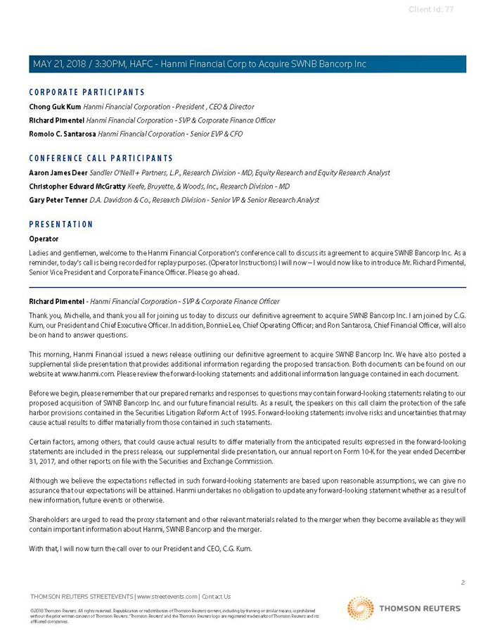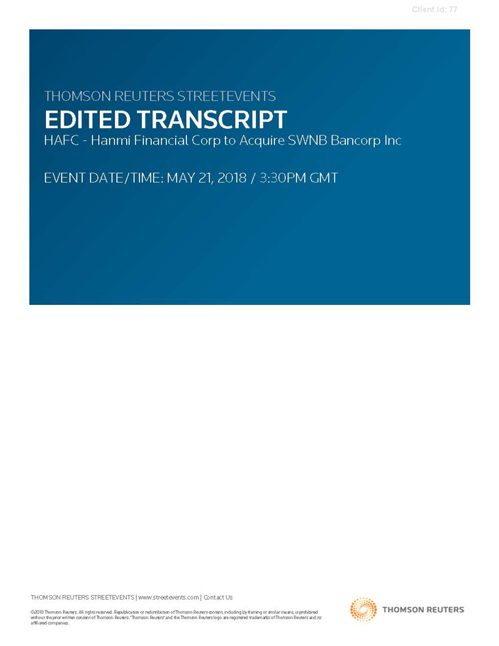 This communication is being made in respect of the proposed merger between Hanmi Financial Corporation (“Hanmi”) and SWNB Bancorp, Inc. (“SWNB”). This communication does not constitute an offer to sell or the solicitation of an offer to buy any securities or a solicitation of any vote or approval.