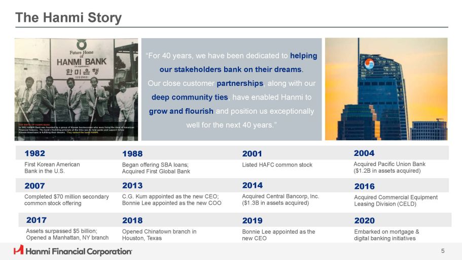 Name Position Banking Experience (Years) Hanmi Experience (Years) Previous Experience Bonnie Lee President & CEO 36 9 BBCN Bancorp, Shinhan Bank America, Nara Bank Romolo Santarosa SEVP, Chief Financial Officer 31 7 Opus Bank, First California Financial Group Anthony Kim EVP, Chief Banking Officer 28 9 BBCN Bancorp Matthew Fuhr EVP, Chief Credit Administration Officer 26 7 Pacific Western Bank, FDIC Mike Park EVP, Chief Credit Risk Officer 34 8 East West Bank Anna Chung EVP, Chief SBA Lending Officer 39 8 East West Bank, Nara Bank, Wilshire Bank, First American Bank Navneeth Naidu EVP, Chief Technology Officer 20 4 Columbia Bank, American Marine Bank, First Capital Bank of Texas Michael Du SVP, Chief Risk Officer 23 3 Pacific Western Bank, Unify Financial Federal Credit Union 4 Management Team