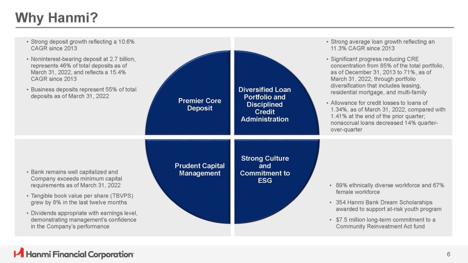 The Hanmi Story “For 40 years, we have been dedicated to helping our stakeholders bank on their dreams . Our close customer partnerships , along with our deep community ties , have enabled Hanmi to grow and flourish and position us exceptionally well for the next 40 years.” 1982 1988 2001 2004 Acquired Pacific Union Bank ($1.2B in assets acquired) 2016 Acquired Commercial Equipment Leasing Division (CELD) 2007 Completed $70 million secondary common stock offering First Korean American Bank in the U.S. Acquired Central Bancorp, Inc. ($1.3B in assets acquired) Began offering SBA loans; Listed HAFC common stock Acquired First Global Bank 2013 2014 2017 2018 2019 2020 5 Opened Chinatown branch in Houston, Texas Embarked on mortgage & digital banking initiatives Bonnie Lee appointed as the new CEO C.G. Kum appointed as the new CEO; Bonnie Lee appointed as the new COO Assets surpassed $5 billion; Opened a Manhattan, NY branch